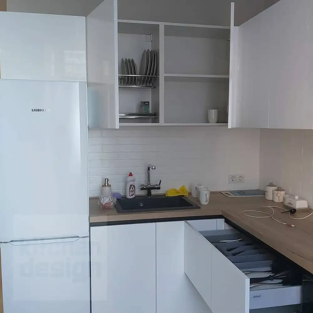 Что такое «базовая комплектация» кухонного гарнитура? Базовая комплектация - это распашные шкафы, без ящичных секций. Что входит: шкафы верхние и нижние, полки, вся необходимая фурнитура, крепёж, петли, ручки, ножки, цоколь. Если вы захотите оснастить кухню дополнительными выкатными и подъёмными механизмами, фурнитурой с доводчиками, остеклением, радиусными фасадами, подсветкой, ящиками в нижних секциях и пр. - то цена кухни может измениться.