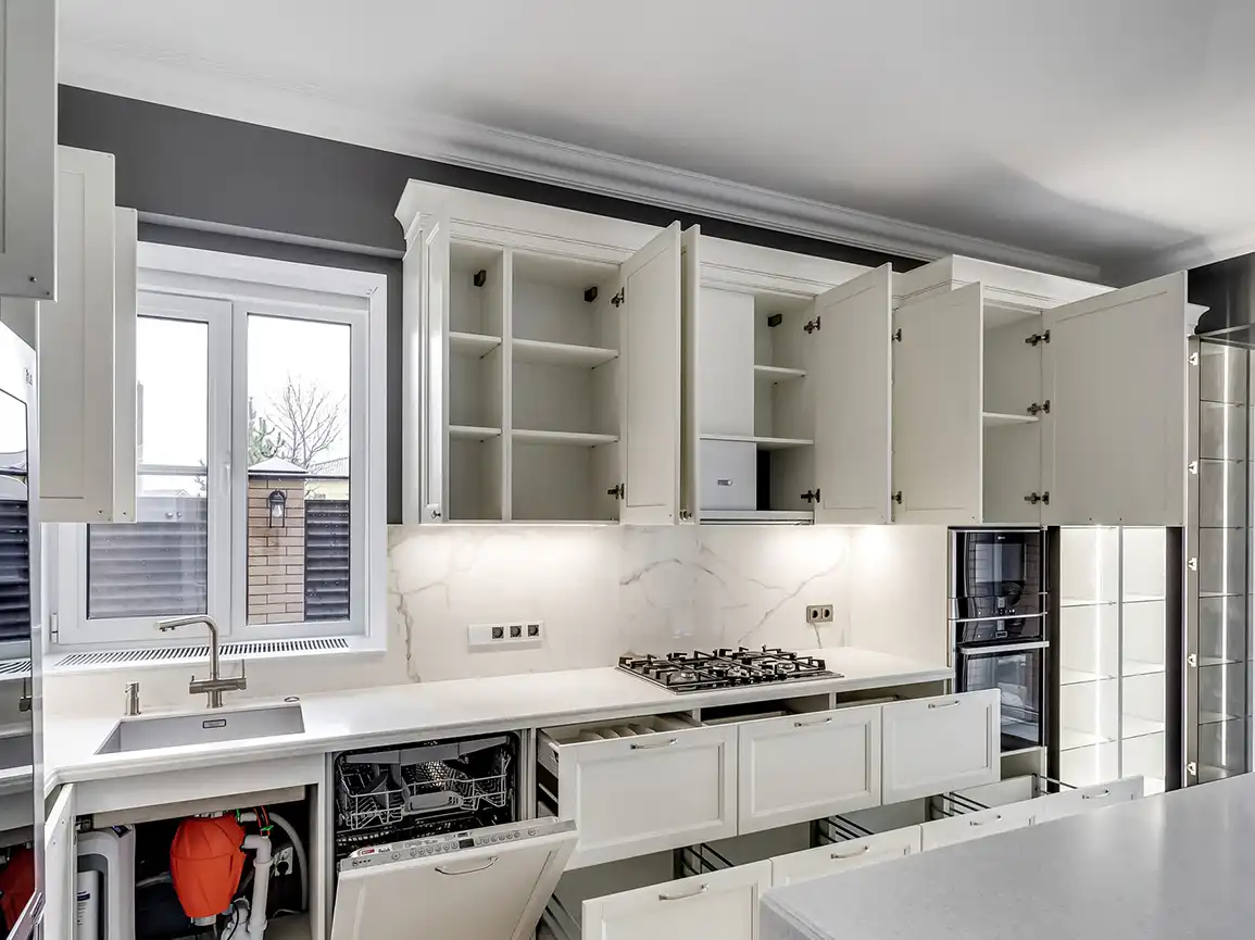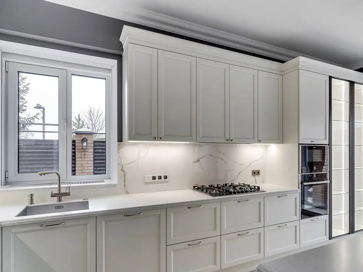Что такое «базовая комплектация» кухонного гарнитура? Базовая комплектация - это распашные шкафы, без ящичных секций. Что входит: шкафы верхние и нижние, полки, вся необходимая фурнитура, крепёж, петли, ручки, ножки, цоколь. Если вы захотите оснастить кухню дополнительными выкатными и подъёмными механизмами, фурнитурой с доводчиками, остеклением, радиусными фасадами, подсветкой, ящиками в нижних секциях и пр. - то цена кухни может измениться.