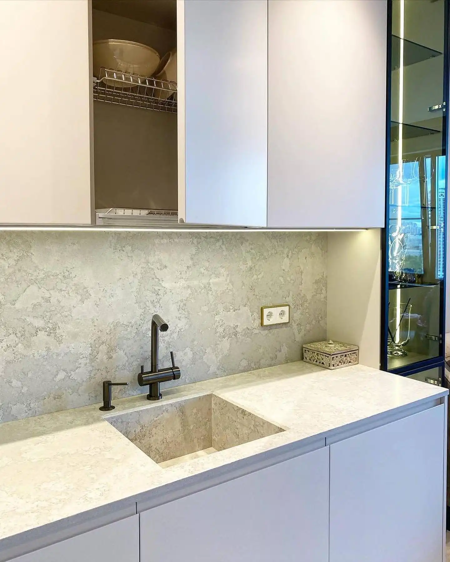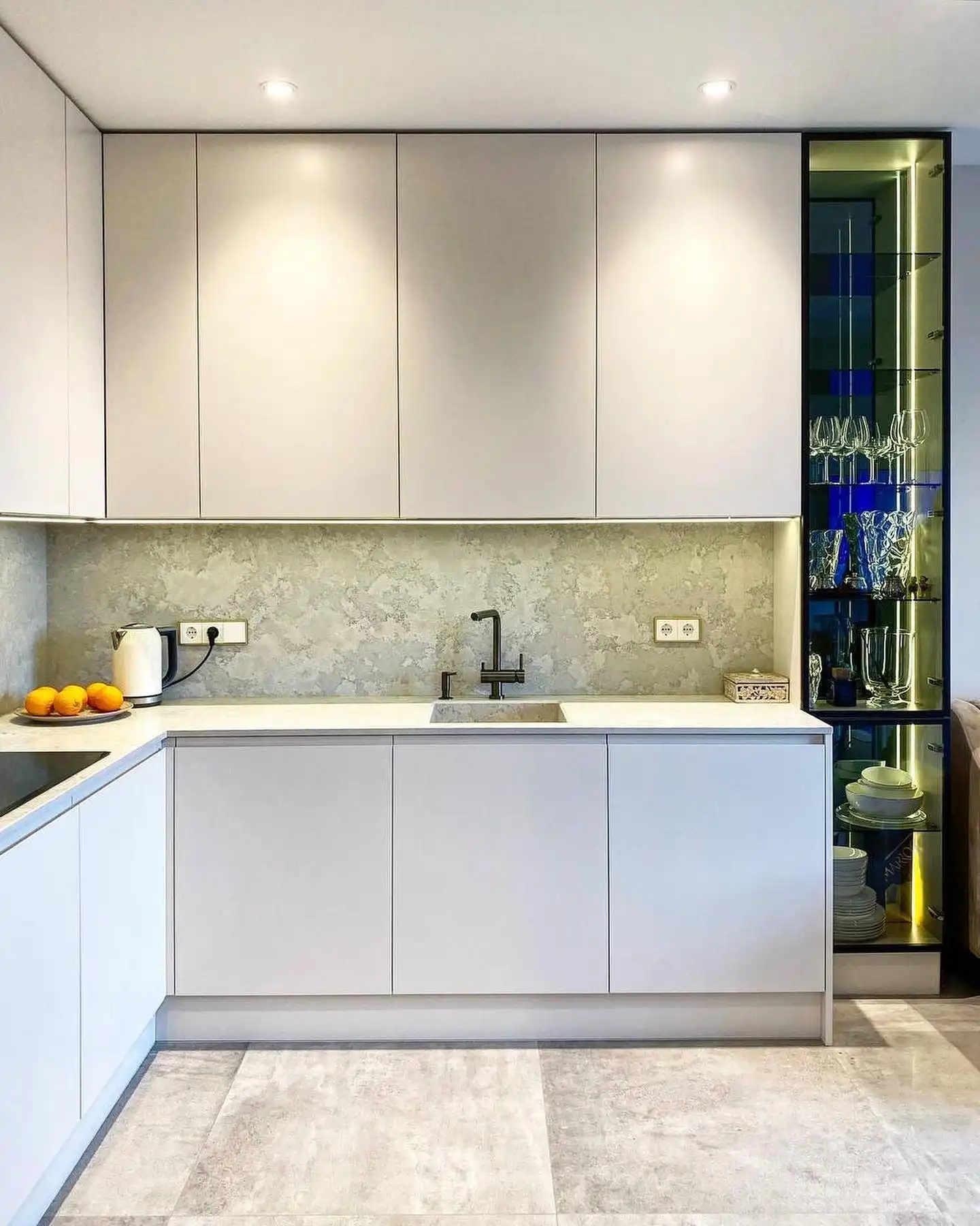 Что такое «базовая комплектация» кухонного гарнитура? Базовая комплектация - это распашные шкафы, без ящичных секций. Что входит: шкафы верхние и нижние, полки, вся необходимая фурнитура, крепёж, петли, ручки, ножки, цоколь. Если вы захотите оснастить кухню дополнительными выкатными и подъёмными механизмами, фурнитурой с доводчиками, остеклением, радиусными фасадами, подсветкой, ящиками в нижних секциях и пр. - то цена кухни может измениться.