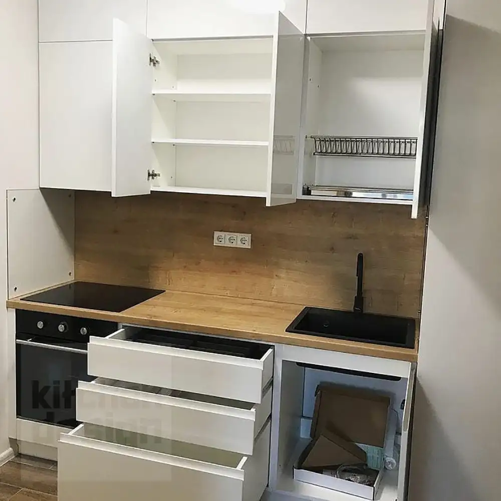 Что такое «базовая комплектация» кухонного гарнитура? Базовая комплектация - это распашные шкафы, без ящичных секций. Что входит: шкафы верхние и нижние, полки, вся необходимая фурнитура, крепёж, петли, ручки, ножки, цоколь. Если вы захотите оснастить кухню дополнительными выкатными и подъёмными механизмами, фурнитурой с доводчиками, остеклением, радиусными фасадами, подсветкой, ящиками в нижних секциях и пр. - то цена кухни может измениться.