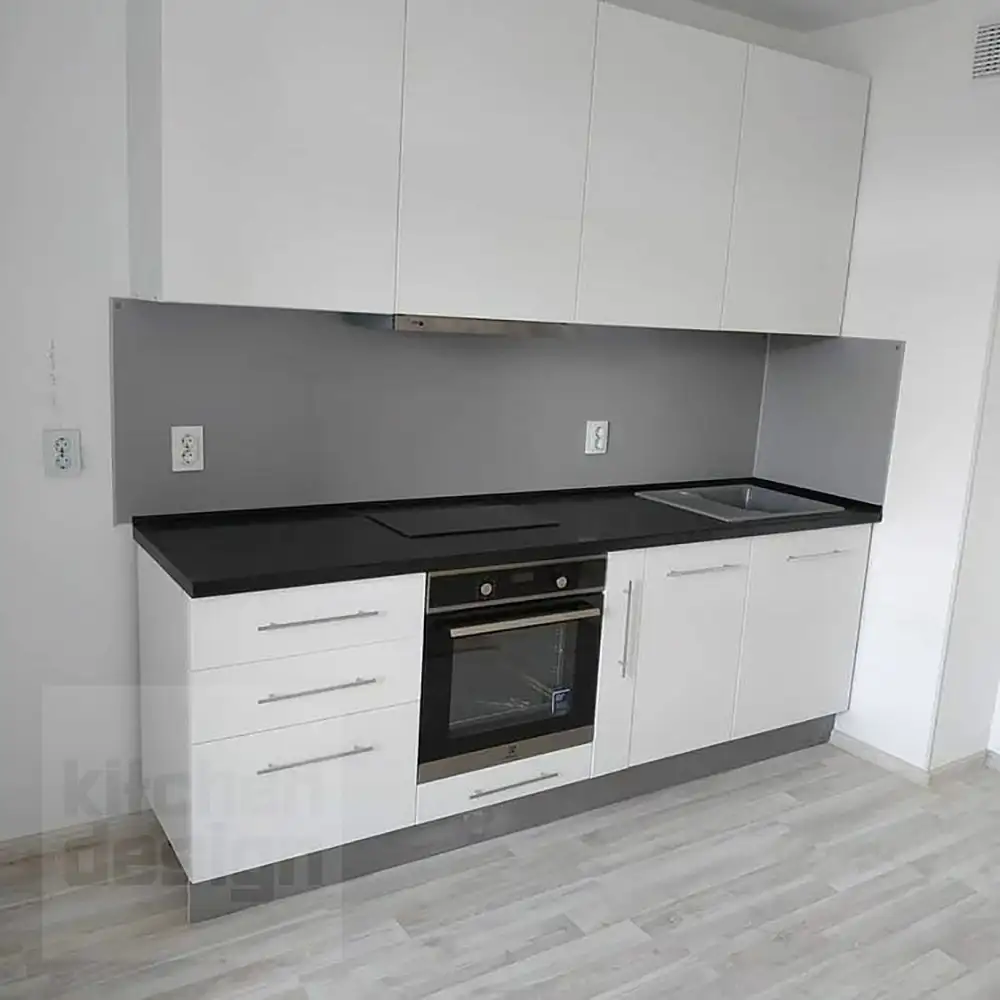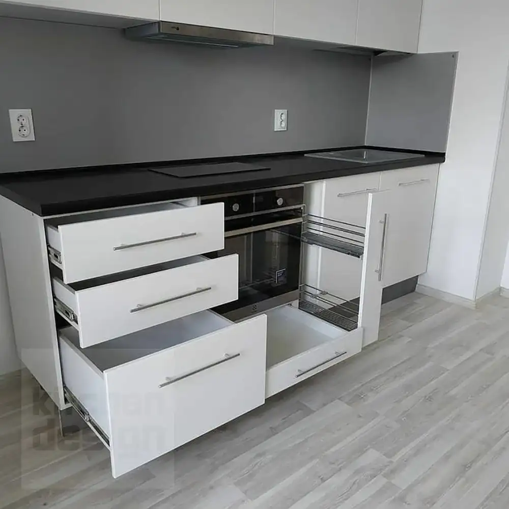 Что такое «базовая комплектация» кухонного гарнитура? Базовая комплектация - это распашные шкафы, без ящичных секций. Что входит: шкафы верхние и нижние, полки, вся необходимая фурнитура, крепёж, петли, ручки, ножки, цоколь. Если вы захотите оснастить кухню дополнительными выкатными и подъёмными механизмами, фурнитурой с доводчиками, остеклением, радиусными фасадами, подсветкой, ящиками в нижних секциях и пр. - то цена кухни может измениться.